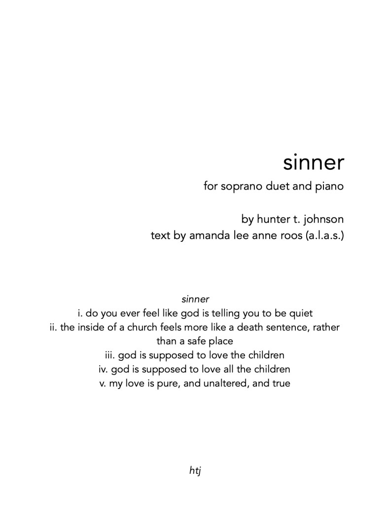 Born from amanda lee anne roos (a.l.a.s.)’s poem sinner, hunter t. johnson collected prayers and scripture that he had heard growing up in the Catholic Church and combined them with amanda’s text. This work was part of the Wet Ink Project at Webster University, and was premiered by three incredible performers: Madeline Lackey, soprano; Brittany Graham, soprano; and Nathan Coleman, piano.